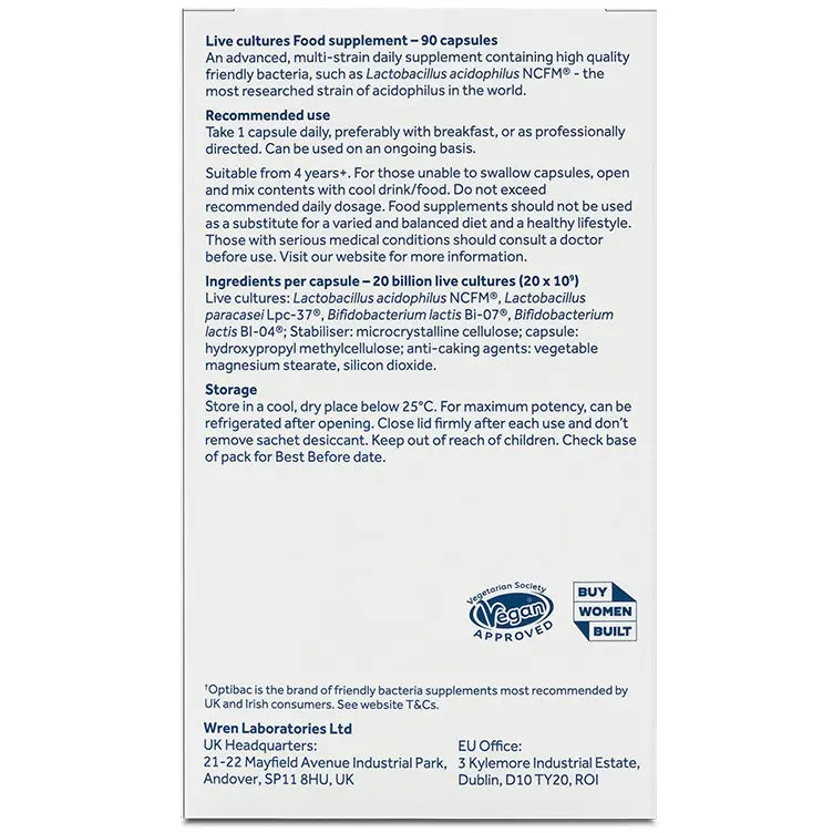 Stabiliser: micro-crystalline cellulose; Live cultures: Lactobacillus acidophilus NCFM®, Lactobacillus paracasei Lpc-37®, Bifidobacterium lactis Bi-07®, Bifidobacterium lactis Bl-04®; vegetarian capsule: hydroxypropyl methylcellulose; anti-caking agents: vegetable magnesium stearate, silicon dioxide.